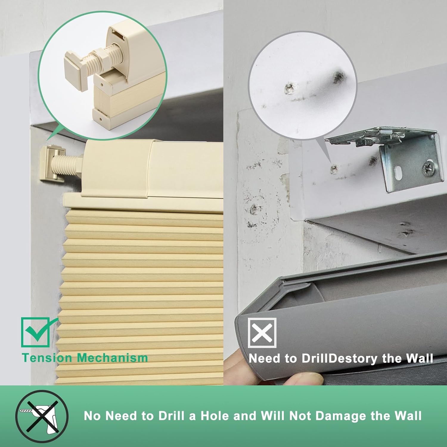 - No Drill Design: A solution to cover your windows without the hassle of drilling holes and install the shades without tools in 30 seconds.